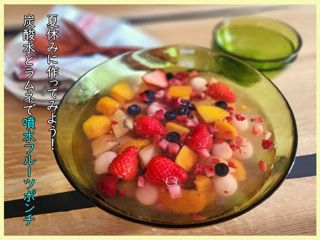 フルーツポンチとは、シロップや炭酸水を混ぜ合わせ、カットしたフルーツを浮かべたデザートです。