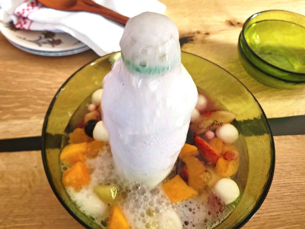 白玉団子はポンチ液の中に長時間つけるとかたくなってしまうので注意してください。