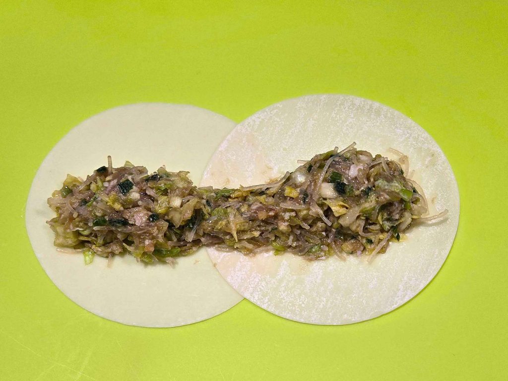 3.餃子の皮2枚を3cmほど重なるようにして置き、(2)のあんを8等分したものをのせる。