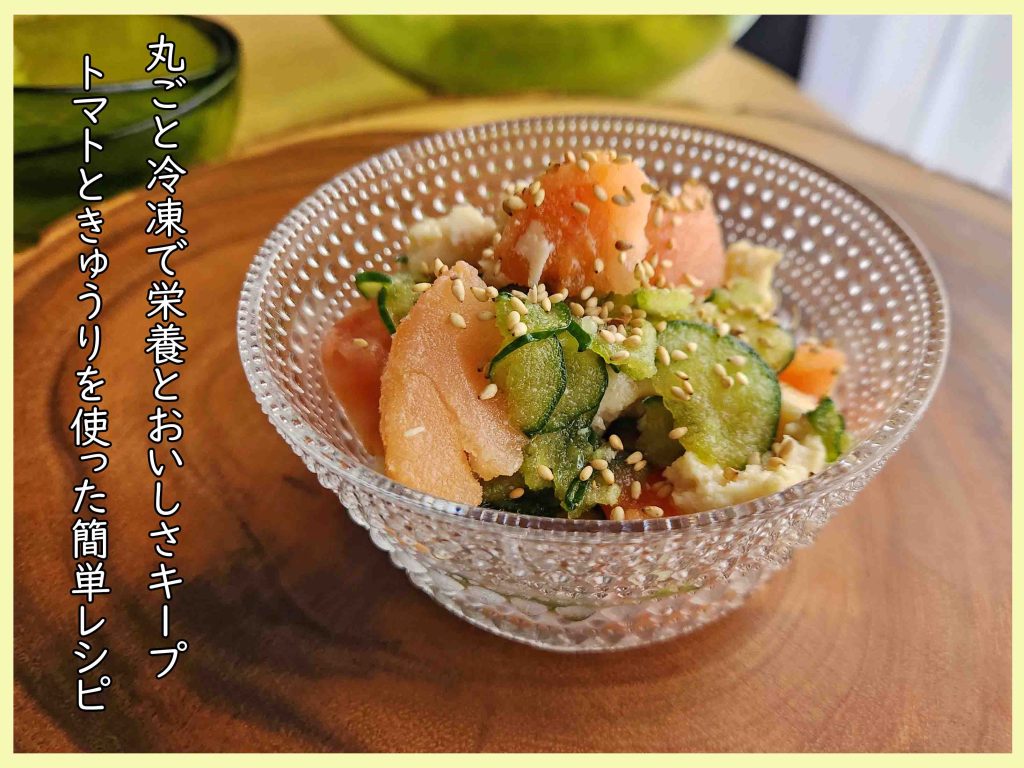 <材料(2人分)> 調理時間:10分冷凍トマト・・1個冷凍きゅうり・・1本サラダチキン・・1パックAポン酢・・小さじ2Aごま油・・小さじ1/2Aしょうが汁・・少々白いりごま・・小さじ1/2