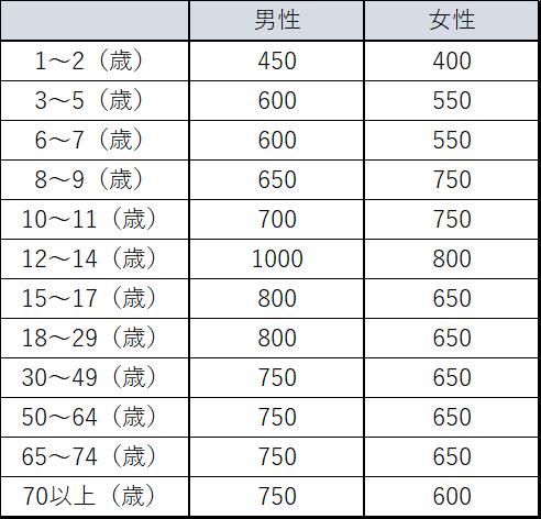 カルシウムの食事摂取推奨量(mg/日)