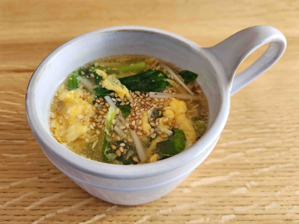 1.小松菜は3cm長さに切り、えのきたけは根元を切り落とし、3cm長さに切って手でほぐしておく2.鍋にA・えのきたけを入れて加熱し、火が通るまで煮る3.(2)に小松菜・Bを加えてさらに1分程煮、Cでトロミをつける4.(3)に溶き卵を回し入れる5.火を止めて、白いりごま・ごま油を加えて器に盛り付ける