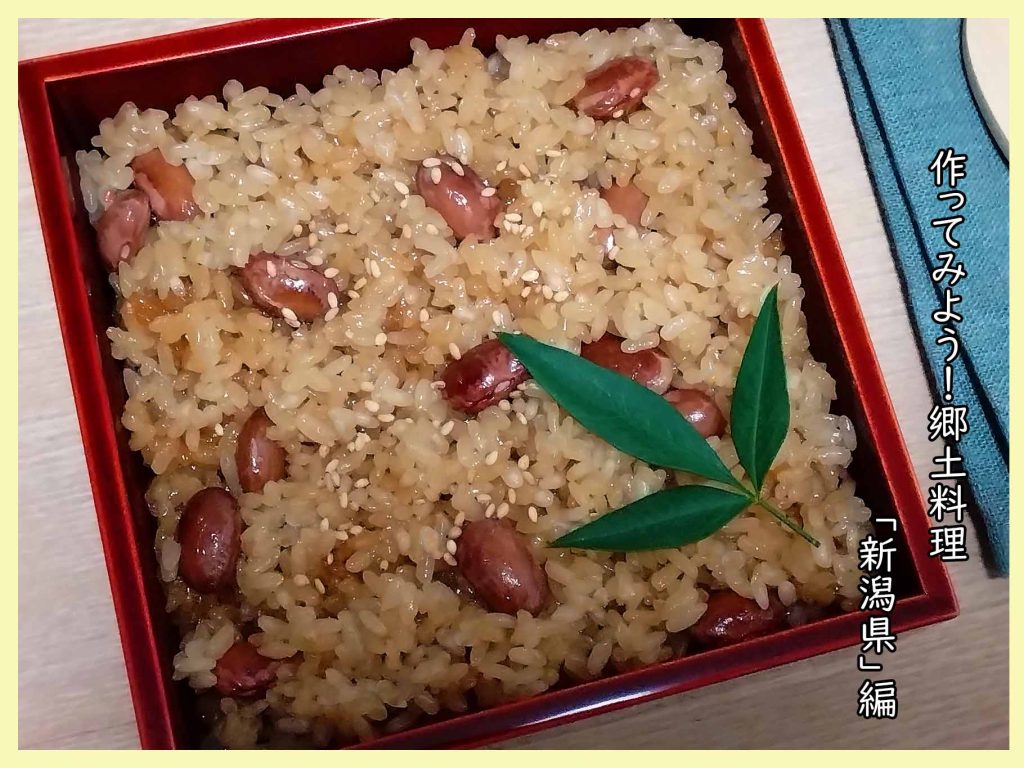 しょうゆで味つけしたもち米に、しょうゆとみりんでふっくらと炊き上げた金時豆をのせて蒸した、新潟県長岡市に伝わるおこわです。