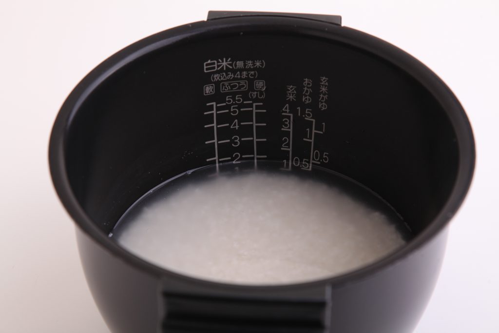 炊飯器の内釜に米・酒を入れ、2合の目盛より少し少なめに水を注ぎ、昆布をのせて炊飯する。