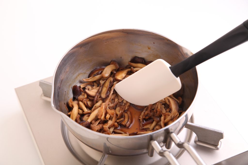 3.鍋に⑵を入れて火にかけ、きのこに焼き色がついてきたらAを加える。