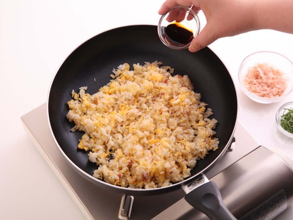 全体が均一になったら鍋肌からしょうゆを回しかけ、塩で味を調え、青しそ・かつお節を加える。