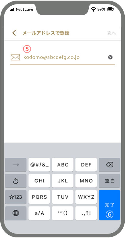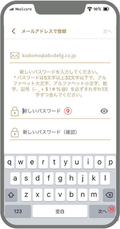 アルファベット小文字(abcdefg…)、アルファベット大文字(ABCDEFG…)、数字(012345…)、記号(-_+$!#%)のどれか3種類を含む組み合わせでお好きなパスワードを設定します。(5文字以上32文字以下) ⑩「次へ」をタップします。