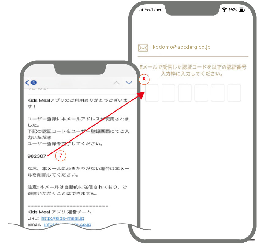 ⑤で入力したメールアドレスに下記の「認証コード」が届きます