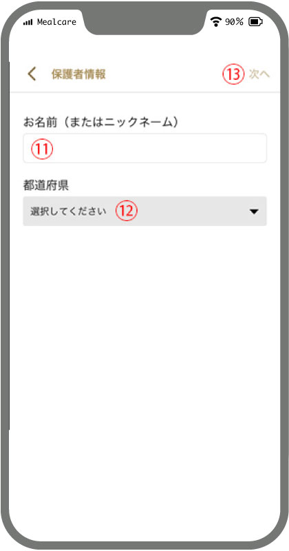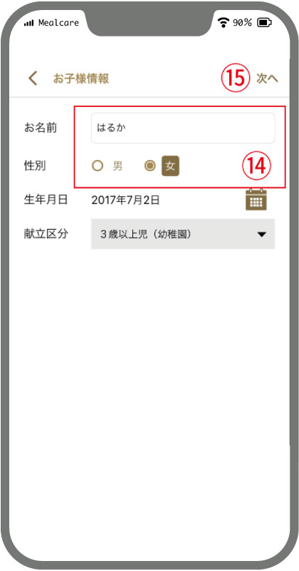 ※献立区分はアプリ内で表示されている区分のみ選択ができます。ご了承ください。 ⑮「次へ」をタップします。