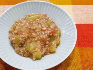 離乳食もいよいよ大詰め。今回は1歳~1歳6カ月ころの離乳食完了期の赤ちゃん向け麻婆茄子風のレシピです。